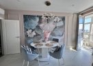 Просторная кухня 16,8 кв м со встроенной техникой и шикарным панно на стене. Зал-гостиная 23,3 кв м с большим диваном, телевизором и мебелью.