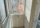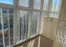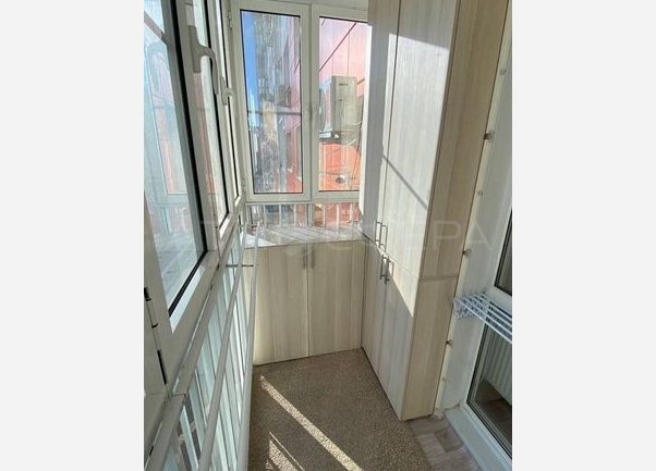 Балкон большой, застеклен до пола, где разместили шкафы и шкафчики. Выход на балкон из кухни.