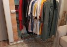 Большой шкаф-кладовка для вещей с подсветкой (фото). С тремя выдвижными вешалами на колесиках, длина каждого вешала 1150 мм. За ними расположены вместительные полки для вещей.